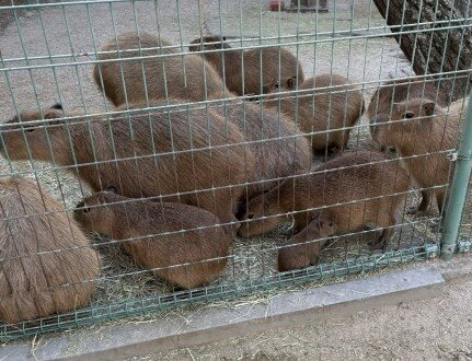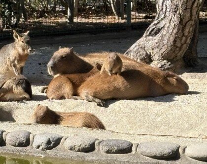 朝エリアにいくと集まって暖をとるカピバラの群れの中に1頭だけとても小さいカピバラが、、、