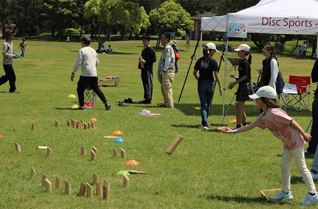 フィンランド発祥のスポーツで、木製の棒を投げてピンを倒し、得点を競うゲーム「モルック」を体験しよう。