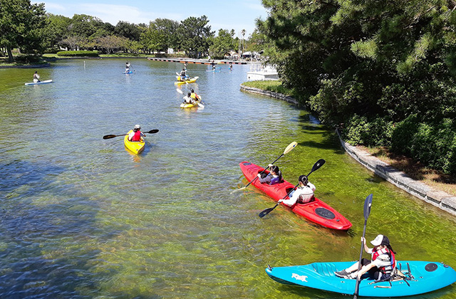 カヤック未経験者向けの乗船体験を公園一広い「カモ池」で実施。漕ぎ方もプロのスタッフが親切に教えます。