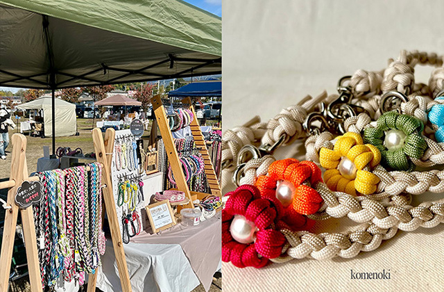 耐久性に優れた丈夫なパラコードで、ワンちゃんの首輪やリード、ストラップを一つひとつ丁寧に編んでいます