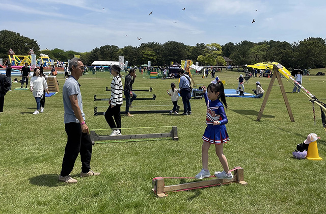ベルト状のラインを利用したスポーツ綱渡り「スラックライン」を体験しよう。プロによるパフォーマンスもあります。