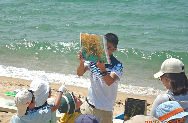 マリンワールド海の中道のガイドによる博多湾側の海岸の生物観察を実施する。