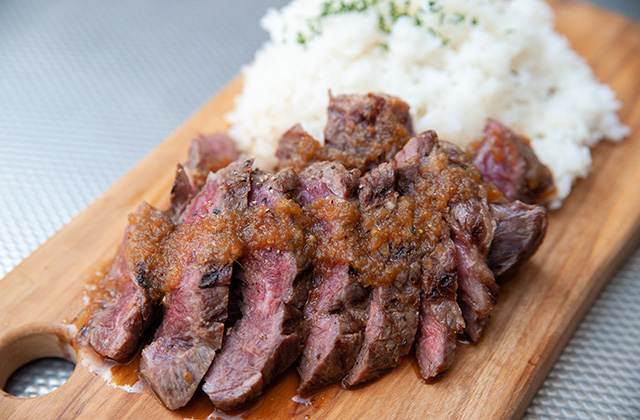 ステーキ丼: ジューシーな最高ランクのプライムビーフを使用したステーキ丼です。